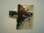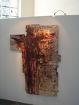 gemengde techniek op hout, ca. 180 x 140 cm. gem. techniek op hout, ca. 50 x 65 cm. met hout als ondergrond, met gemengde technieken een serie werken gemaakt die een kruis verbeelden