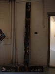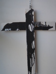 2006houten kruisvorm, die ook los van elkaar kunnen worden opgehangen, of neergezet, beplakt met zwart/wit foto's en beschilderd met inkt en witte en gouden acrylverf