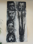 koppen op foto's op papier in gemengde techniek geschilderd/ ca. 80 x 110 cm. een serie, geschilderd over kleine portretfoto's, waarbij allerlei verschillende portretten een eenheid met de achtergrond aangaan. En andere koppen in zwart/wit