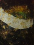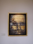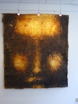 2003een gedeelte van een 'kop', op papier, geplakt op doek, waarbij de goudkleur in het oog springt, en de structuur gemaakt is door koffie.